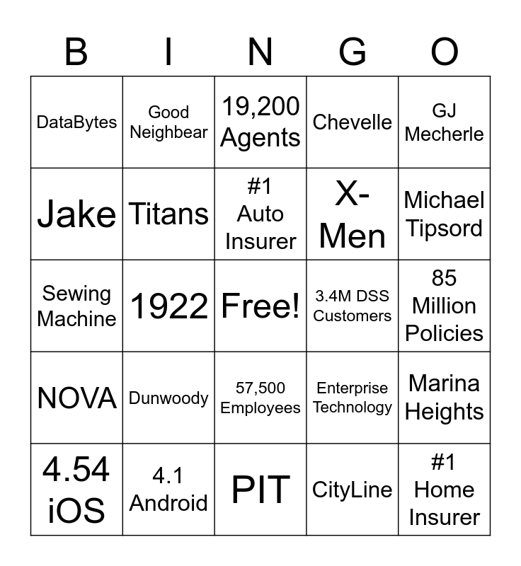 This bingo card has a free space and 42 words: State Farm, #1 Auto Insurer, Bloomington, Dunwoody, CityLine, Marina Heights, #1 Home Insurer, #36 Fortune List, 19,200 Agents, 57,500 Employees, 85 Million Policies, Michael Tipsord, 1922, GJ Mecherle, Drive Safe and Save, Enterprise Technology, Skates, Sewing Machine, Like a Good Neighbor!, Good Neighbear, Jake, Telematics, Turks, DataBytes, Oblivion, Atlantis, X-Men, Caicos, Avengers, KnightRiders, Bolivar, NOVA, Titans, PIT, Ting, 4.54 iOS, 4.1 Android, 3.4M DSS Customers, Ford, Architecture, Chevelle and Unicron.