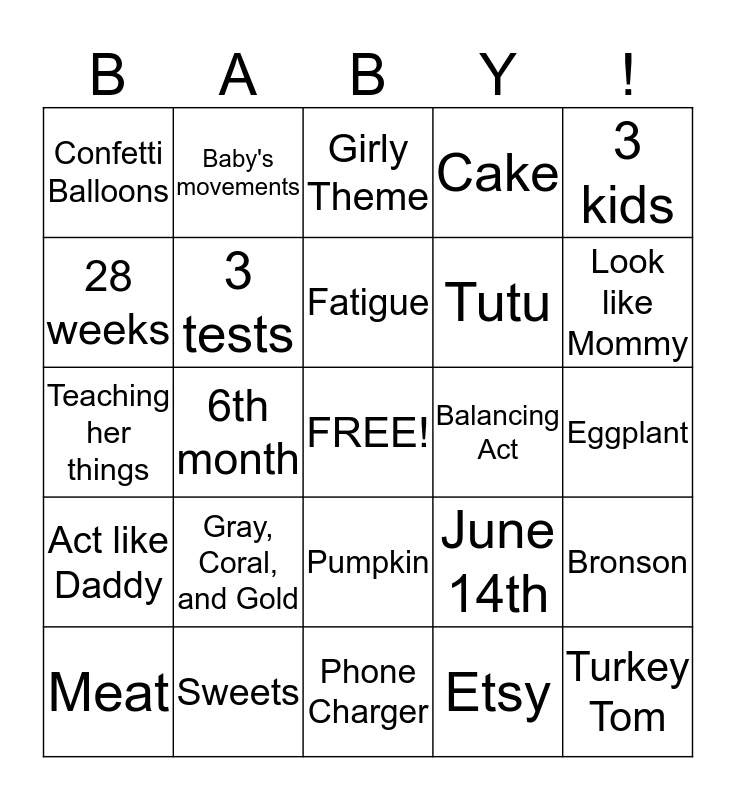 This bingo card has a free space and 24 words: Gray, Coral, and Gold, Sweets, Fatigue, Meat, 3 kids, Confetti Balloons, 28 weeks, Baby's movements, Balancing Act, Pumpkin, Tutu, Teaching her things, June 14th, Bronson, 3 tests, Etsy, Eggplant, Girly Theme, Look like Mommy, 6th month, Turkey Tom, Act like Daddy, Cake and Phone Charger.