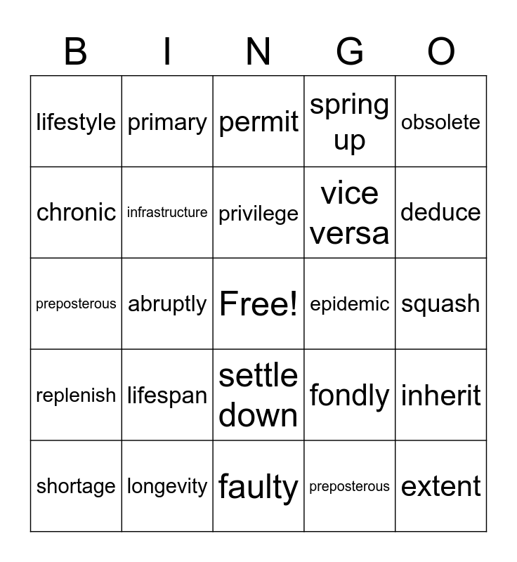This bingo card has a free space and 24 words: lifespan, longevity, privilege, shortage, obsolete, lifestyle, chronic, primary, epidemic, settle down, vice versa, preposterous, fondly, inherit, infrastructure, preposterous, squash, permit, deduce, abruptly, extent, replenish, spring up and faulty.