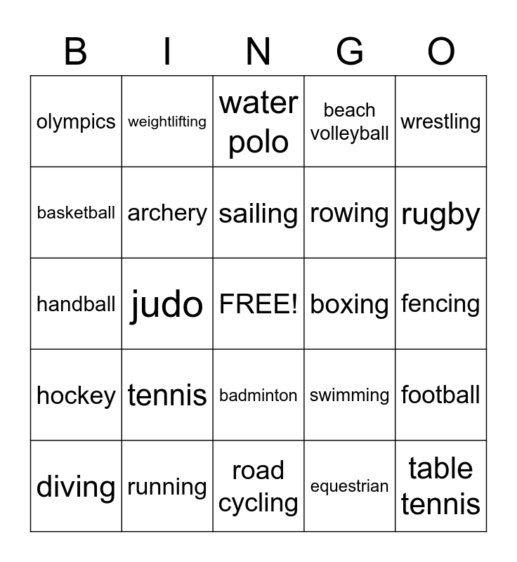 This bingo card has a free space and 24 words: tennis, running, sailing, diving, wrestling, olympics, basketball, weightlifting, boxing, badminton, rowing, handball, swimming, football, archery, equestrian, fencing, water polo, rugby, judo, table tennis, hockey, beach volleyball and road cycling.