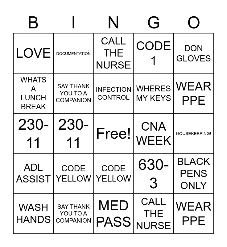 This bingo card has a free space and 49 words: 11-7, WEAR PPE, WASH HANDS, MED PASS, CODE YELLOW, ADL ASSIST, DOCUMENTATION, NARC COUNT, WHATS A LUNCH BREAK, SHOWER ASSIST, SAY THANK YOU TO A COMPANION, CODE 1, BLACK PENS ONLY, 630-3, HOUSKEEPING!!, CNA RULES, INFECTION CONTROL, CNA WEEK, WEAR YOUR MASK, DON GLOVES, 230-11, CALL THE NURSE, LOVE, WHERES MY KEYS, 11-7, WEAR PPE, WASH HANDS, MED PASS, CODE YELLOW, ADL ASSIST, DOCUMENTATION, NARC COUNT, WHATS A LUNCH BREAK, SHOWER ASSIST, SAY THANK YOU TO A COMPANION, CODE 1, ADL, 630-3, HOUSEKEEPING!, CNA RULES, INFECTION CONTROL, CNA WEEK, WEAR YOUR MASK, DON GLOVES, 230-11, CALL THE NURSE, LOVE, WHERES MY KEYS and BLACK PENS ONLY.