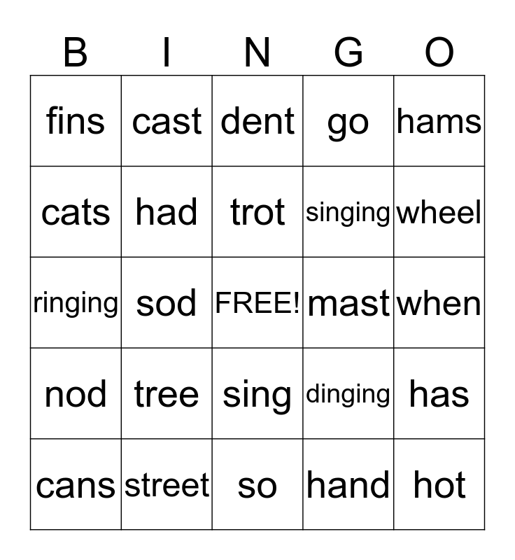 This bingo card has a free space and 24 words: tree, street, trot, cans, hams, fins, cats, cast, mast, sing, singing, ringing, dinging, has, had, hand, when, dent, wheel, sod, hot, nod, go and so.