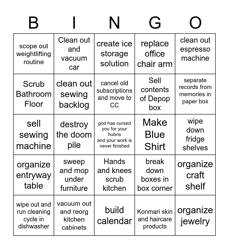 This bingo card has a free space and 24 words: sweep and mop under furniture, vacuum out and reorg kitchen cabinets, cancel old subscriptions and move to CC, wipe out and run cleaning cycle in dishwasher, clean out espresso machine, scope out weightlifting routine, Scrub Bathroom Floor, Clean out and vacuum car, Make Blue Shirt, Hands and knees scrub kitchen, Sell contents of Depop box, sell sewing machine, break down boxes in box corner, organize craft shelf, clean out sewing backlog, Konmari skin and haircare products, wipe down fridge shelves, create ice storage solution, separate records from memories in paper box, destroy the doom pile, organize jewelry, organize entryway table, replace office chair arm and build calendar.