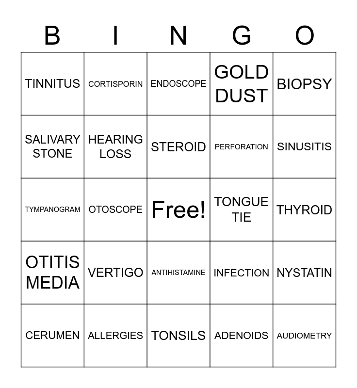 This bingo card has a free space and 29 words: CERUMEN, DIZZINESS, OTOSCOPE, ANTIBIOTIC, TINNITUS, ENDOSCOPE, HEARING LOSS, VERTIGO, TONGUE TIE, ALLERGIES, THYROID, AUDIOMETRY, TONSILS, ADENOIDS, SINUSITIS, NYSTAGMUS, ANTIHISTAMINE, OTITIS MEDIA, BIOPSY, TYMPANOGRAM, INFECTION, EAR DRUM, PERFORATION, SALIVARY STONE, GOLD DUST, CORTISPORIN, NYSTATIN, STEROID and SNORING.