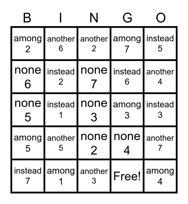 This bingo card has 30 words: among 1, another 1, instead 1, none 1, among 2, another 2, instead 2, none 2, among 3, another 3, instead 3, none 3, Free!, among 4, another 4, instead 4, none 4, among 5, another 5, instead 5, none 5, among 6, another 6, instead 6, none 6, among 7, another 7, instead 7, none 7 and another 8.