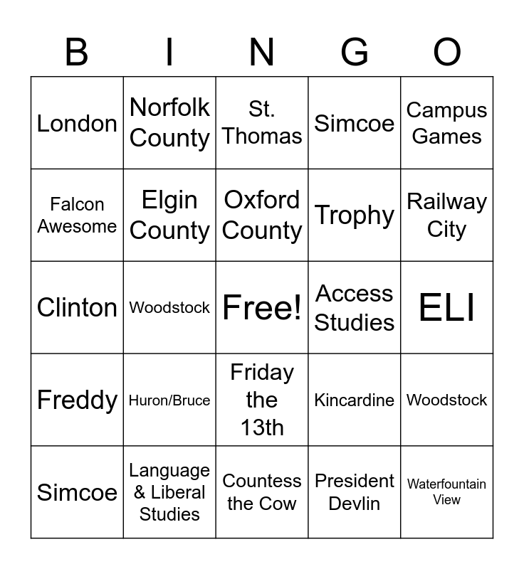 This bingo card has a free space and 29 words: Simcoe, Norfolk County, Woodstock, Oxford County, London, St. Thomas, Elgin County, Huron/Bruce, Access Studies, Language & Liberal Studies, ELI, Waterfountain View, Countess the Cow, President Devlin, Railway City, Jumbo, Friday the 13th, Freddy, Campus Games, Clinton, Kincardine, Goderich, Trophy, Falcon Awesome, Simcoe, Norfolk County, Woodstock, Oxford County and London.