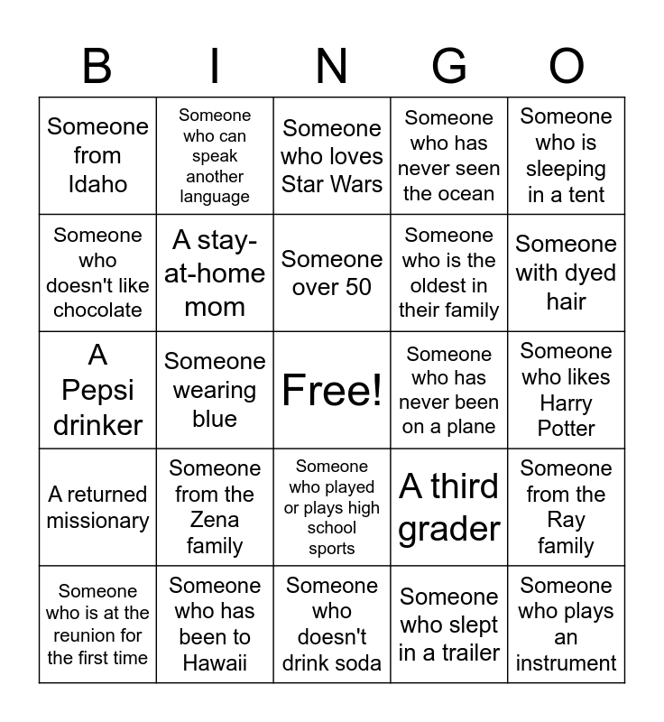 This bingo card has a free space and 24 words: Someone from the Zena family, Someone who has been to Hawaii, Someone over 50, Someone who is at the reunion for the first time, Someone who is sleeping in a tent, Someone from Idaho, Someone who doesn't like chocolate, Someone who can speak another language, Someone who has never been on a plane, Someone who played or plays high school sports, Someone who is the oldest in their family, A Pepsi drinker, A third grader, Someone from the Ray family, A stay-at-home mom, Someone who slept in a trailer, Someone who likes Harry Potter, Someone who loves Star Wars, Someone with dyed hair, Someone wearing blue, Someone who plays an instrument, A returned missionary, Someone who has never seen the ocean and Someone who doesn't drink soda.