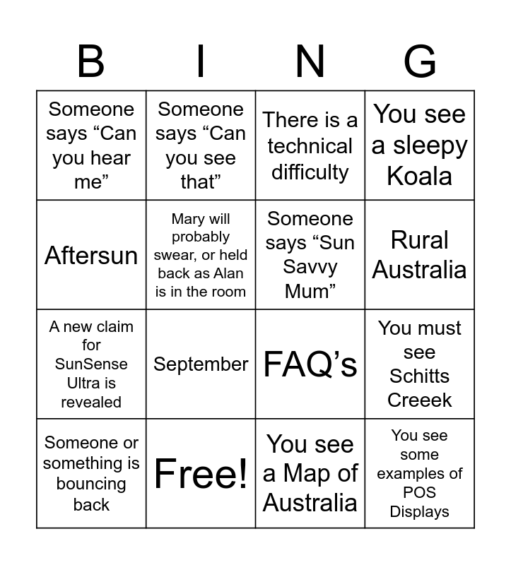 This bingo card has 22 words: Free!, Someone says “Can everyone see my screen”, Someone says “Can you see that”, Someone says “ You’re on mute”, Mary will probably swear, or held back as Alan is in the room, Someone says “Sun Savvy Mum”, Someone says “Can you hear me”, There is a technical difficulty, FAQ’s, You see some examples of POS Displays, A new claim for SunSense Ultra is revealed, You see a sleepy Koala, SunSense reveals new updates to the $1 campaign, 72 units, You see a Map of Australia, New Zealand, You must see Schitts Creeek, Someone or something is bouncing back, September, Aftersun, Rural Australia and Dr Deshan.