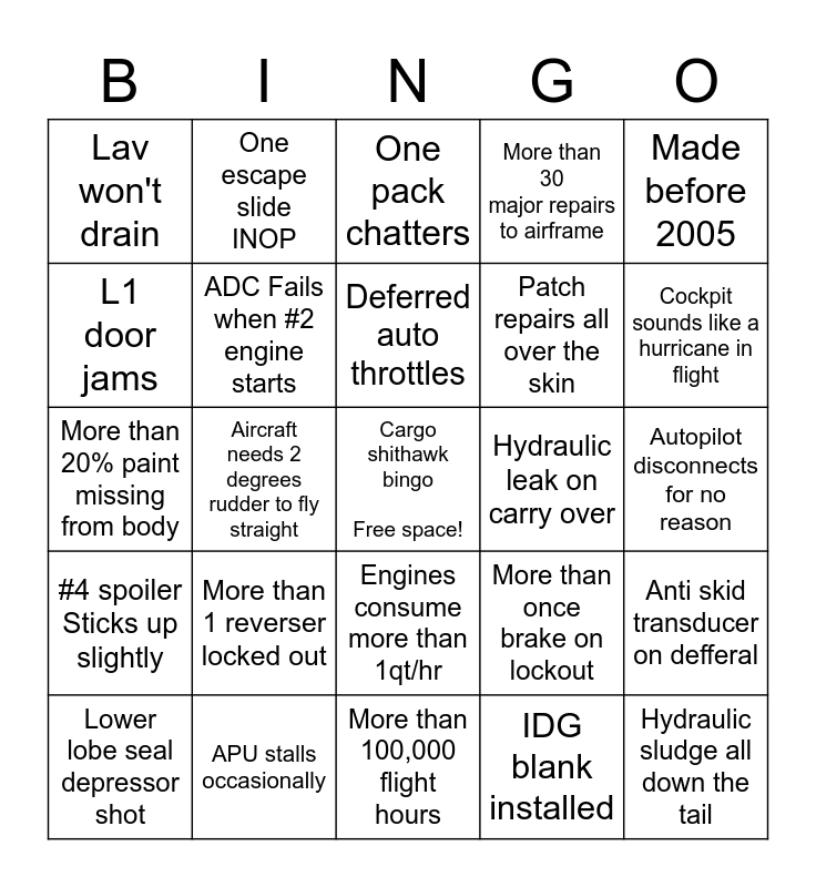 This bingo card has a free space and 24 words: More than 1 reverser locked out, APU stalls occasionally, Deferred auto throttles, Lower lobe seal depressor shot, Made before 2005, Lav won't drain, L1 door jams, One escape slide INOP, Hydraulic leak on carry over, Engines consume more than 1qt/hr, Patch repairs all over the skin, More than 20% paint missing from body, More than once brake on lockout, Anti skid transducer on defferal, ADC Fails when #2 engine starts, IDG blank installed, Autopilot disconnects for no reason, One pack chatters, Cockpit sounds like a hurricane in flight, Aircraft needs 2 degrees rudder to fly straight, Hydraulic sludge all down the tail, #4 spoiler Sticks up slightly, More than 30 major repairs to airframe and More than 100,000 flight hours.