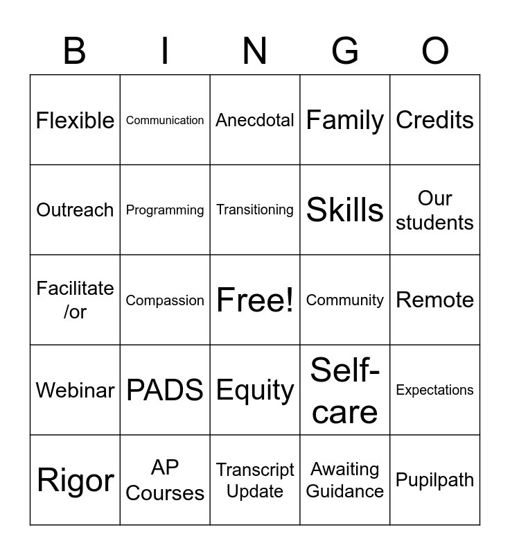 This bingo card has a free space and 29 words: Rigor, Assessment, Compassion, NX, Flexible, Anecdotal, Programming, PADS, Community, AP Courses, Remote, Pupilpath, Transcript Update, Awaiting Guidance, Our students, Mindfulness, Equity, Webinar, Credits, Facilitate /or, Self-care, Graduation Requirements, Skills, Outreach, Family, Communication, Expectations, Transitioning and Collaboration.