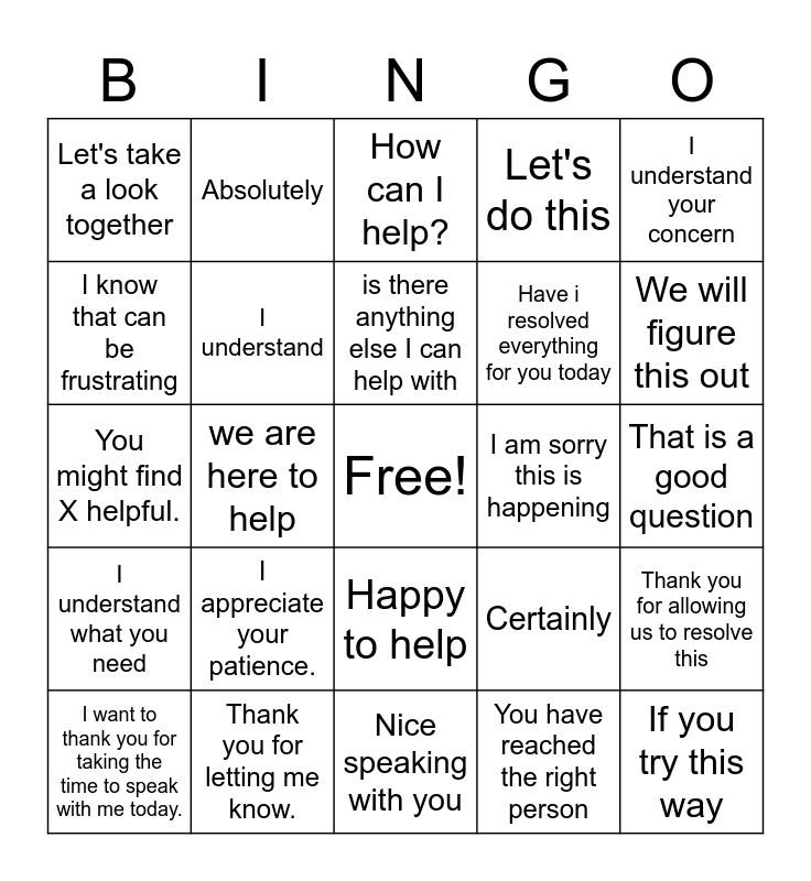 This bingo card has a free space and 24 words: I appreciate your patience., Thank you for letting me know., is there anything else I can help with, I want to thank you for taking the time to speak with me today., I understand your concern, Let's take a look together, I know that can be frustrating, Absolutely, I am sorry this is happening, Happy to help, Have i resolved everything for you today, You might find X helpful., Certainly, Thank you for allowing us to resolve this, I understand, You have reached the right person, That is a good question, How can I help?, We will figure this out, we are here to help, If you try this way, I understand what you need, Let's do this and Nice speaking with you.