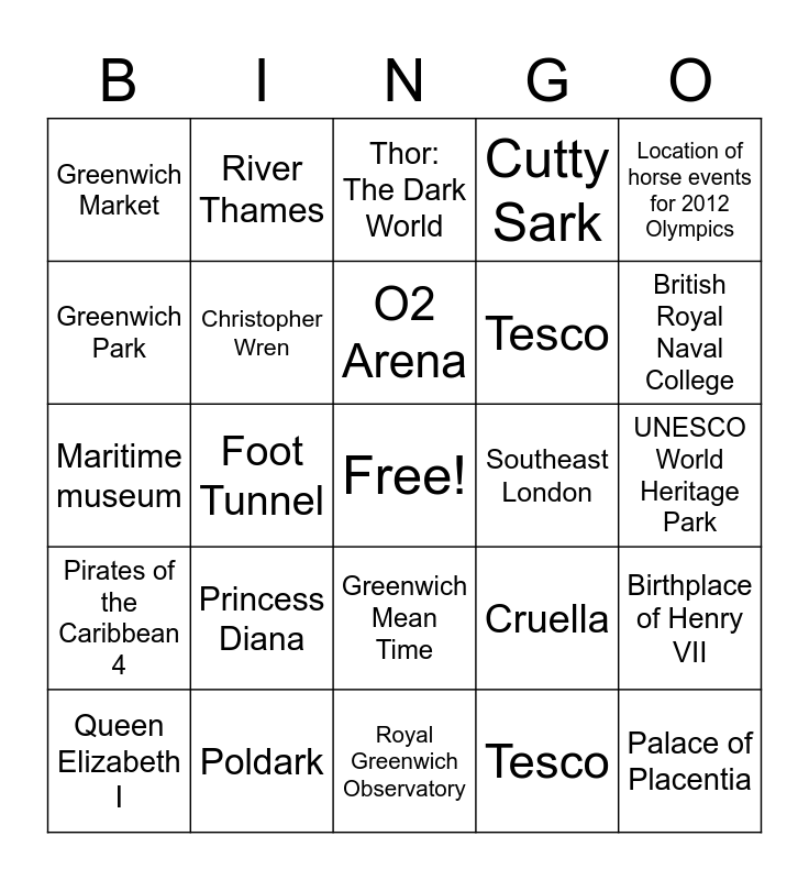 This bingo card has a free space and 24 words: Princess Diana, Poldark, O2 Arena, Queen Elizabeth I, Location of horse events for 2012 Olympics, Greenwich Market, Greenwich Park, River Thames, Southeast London, Greenwich Mean Time, Tesco, Maritime museum, Cruella, Birthplace of Henry VII, Christopher Wren, Tesco, UNESCO World Heritage Park, Thor: The Dark World, British Royal Naval College, Foot Tunnel, Palace of Placentia, Pirates of the Caribbean 4, Cutty Sark and Royal Greenwich Observatory.