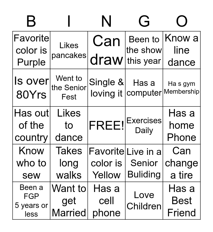 This bingo card has a free space and 24 words: Takes long walks, Want to get Married, Single & loving it, Been a FGP 5 years or less, Know a line dance, Favorite color is Purple, Is over 80Yrs, Likes pancakes, Exercises Daily, Favorite color is Yellow, Has a computer, Has out of the country, Live in a Senior Buliding, Can change a tire, Went to the Senior Fest, Love Children, Has a home Phone, Can draw, Ha s gym Membership, Likes to dance, Has a Best Friend, Know who to sew, Been to the show this year and Has a cell phone.