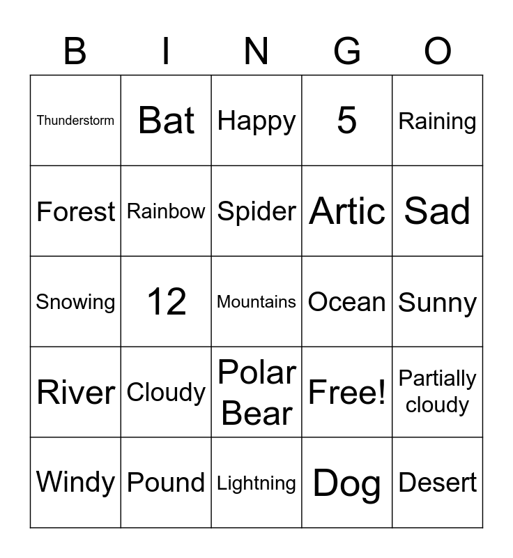 This bingo card has 25 words: Cloudy, Lightning, Spider, Windy, Raining, Thunderstorm, Forest, Bat, Ocean, Polar Bear, Artic, Snowing, Free!, Partially cloudy, Rainbow, Desert, Sunny, Happy, Sad, 12, Mountains, Pound, River, 5 and Dog.
