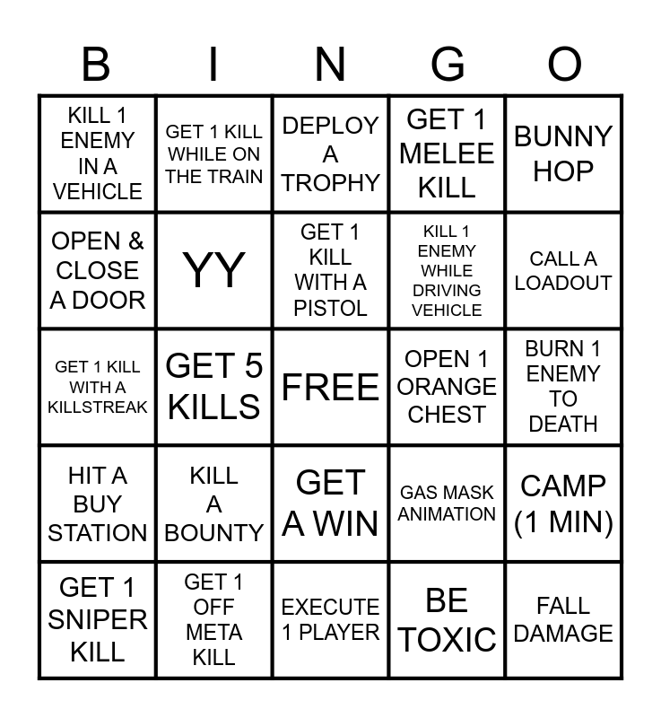 This bingo card has a free space and 24 words: KILL A BOUNTY, GET 1 OFF META KILL, GET 1 KILL WITH A PISTOL, GET 1 SNIPER KILL, BUNNY HOP, KILL 1 ENEMY IN A VEHICLE, OPEN & CLOSE A DOOR, GET 1 KILL WHILE ON THE TRAIN, OPEN 1 ORANGE CHEST, GET A WIN, KILL 1 ENEMY WHILE DRIVING VEHICLE, GET 1 KILL WITH A KILLSTREAK, GAS MASK ANIMATION, CAMP (1 MIN), YY, BE TOXIC, BURN 1 ENEMY TO DEATH, DEPLOY A TROPHY, CALL A LOADOUT, GET 5 KILLS, FALL DAMAGE, HIT A BUY STATION, GET 1 MELEE KILL and EXECUTE 1 PLAYER.