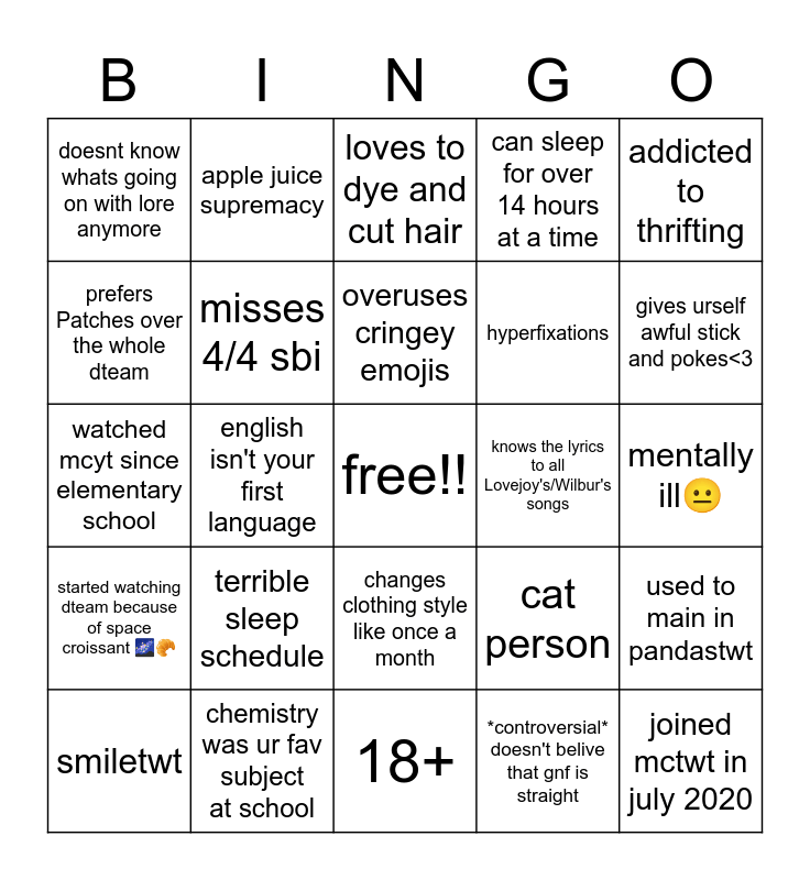 This bingo card has a free space and 24 words: terrible sleep schedule, chemistry was ur fav subject at school, overuses cringey emojis, smiletwt, addicted to thrifting, doesnt know whats going on with lore anymore, prefers Patches over the whole dteam, apple juice supremacy, knows the lyrics to all Lovejoy's/Wilbur's songs, changes clothing style like once a month, hyperfixations, watched mcyt since elementary school, cat person, used to main in pandastwt, misses 4/4 sbi, *controversial* doesn't belive that gnf is straight, mentally ill😐, loves to dye and cut hair, gives urself awful stick and pokes<3, english isn't your first language, joined mctwt in july 2020, started watching dteam because of space croissant 🌌🥐, can sleep for over 14 hours at a time and 18+.
