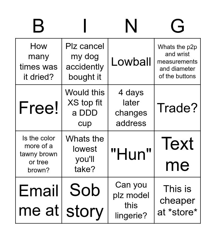 This bingo card has 16 words: Sob story, Text me, Lowball, How many times was it dried?, Is the color more of a tawny brown or tree brown?, Plz cancel my dog accidently bought it, "Hun", Can you plz model this lingerie?, Free!, Would this XS top fit a DDD cup, Email me at, Whats the p2p and wrist measurements and diameter of the buttons, Whats the lowest you'll take?, Trade?, 4 days later changes address and This is cheaper at *store*.