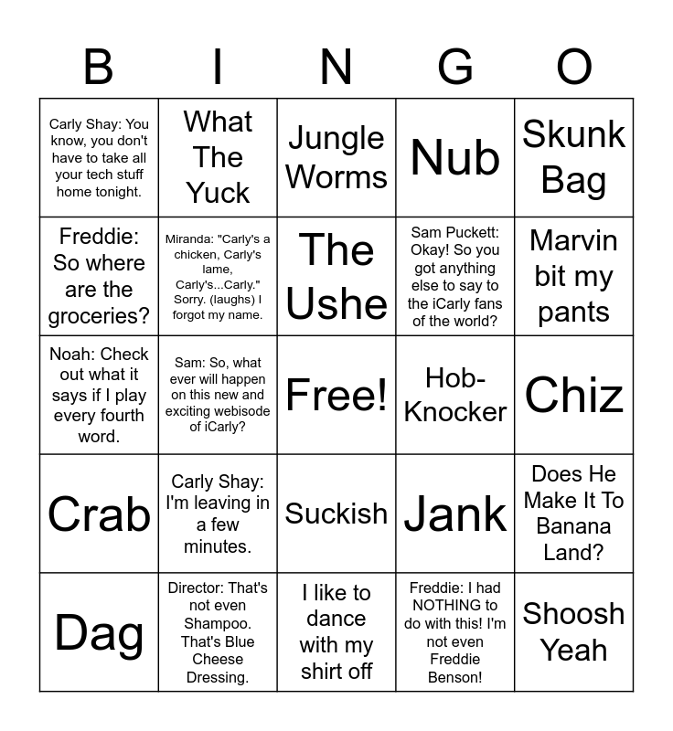 This bingo card has a free space and 24 words: Carly Shay: I'm leaving in a few minutes., Director: That's not even Shampoo. That's Blue Cheese Dressing., The Ushe, Dag, Skunk Bag, Carly Shay: You know, you don't have to take all your tech stuff home tonight., Freddie: So where are the groceries?, What The Yuck, Hob-Knocker, Suckish, Sam Puckett: Okay! So you got anything else to say to the iCarly fans of the world?, Noah: Check out what it says if I play every fourth word., Jank, Does He Make It To Banana Land?, Miranda: "Carly's a chicken, Carly's lame, Carly's...Carly." Sorry. (laughs) I forgot my name., Freddie: I had NOTHING to do with this! I'm not even Freddie Benson!, Chiz, Jungle Worms, Marvin bit my pants, Sam: So, what ever will happen on this new and exciting webisode of iCarly?, Shoosh Yeah, Crab, Nub and I like to dance with my shirt off.