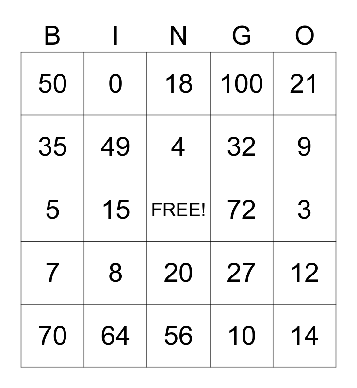 This bingo card has a free space and 42 words: 2, 4, 6, 8, 10, 12, 14, 16, 18, 20, 3, 9, 15, 21, 24, 27, 30, 5, 25, 0, 35, 40, 45, 50, 28, 36, 32, 42, 48, 54, 60, 7, 49, 56, 63, 70, 64, 72, 81, 90, 100 and 80.