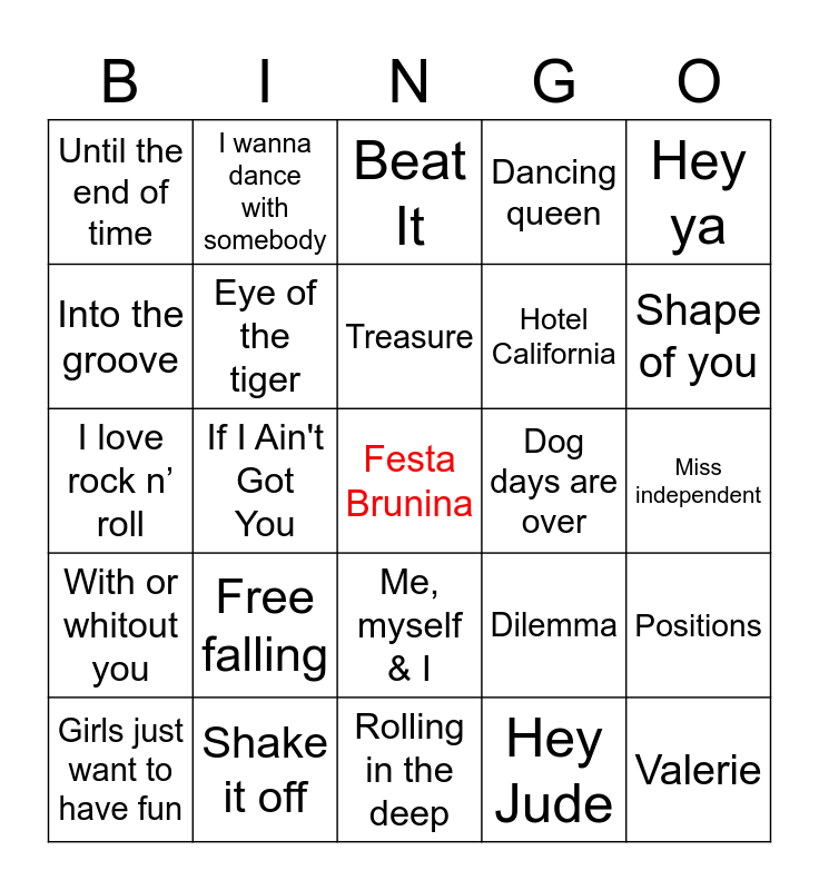 This bingo card has a free space and 28 words: Positions, Under the bridge, Hotel California, Hey Jude, Into the groove, Beat It, I wanna dance with somebody, With or whitout you, Dog days are over, Girls just want to have fun, I love rock n’ roll, Dancing queen, Shake it off, Rolling in the deep, Shape of you, YMCA, Free falling, Eye of the tiger, Treasure, Me, myself & I, Until the end of time, Feeling good, Valerie, If I Ain't Got You, Miss independent, Dilemma, Hey ya and Joke’s on you.