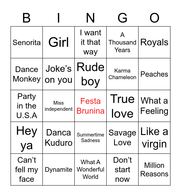 This bingo card has a free space and 33 words: Valerie, If I Ain't Got You, Miss independent, Dilemma, Hey ya, Joke’s on you, Royals, Can’t fell my face, Girl, Umbrella, Rude boy, I want it that way, Wannabe, I’m with you, True love, Peaches, Dynamite, Party in the U.S.A, Danca Kuduro, Savage Love, Summertime Sadness, Gravity, Senorita, What a Feeling, What A Wonderful World, Million Reasons, A Thousand Years, Karma Chameleon, Dance Monkey, Like a virgin, Memories, Don’t start now and Stuck with you.