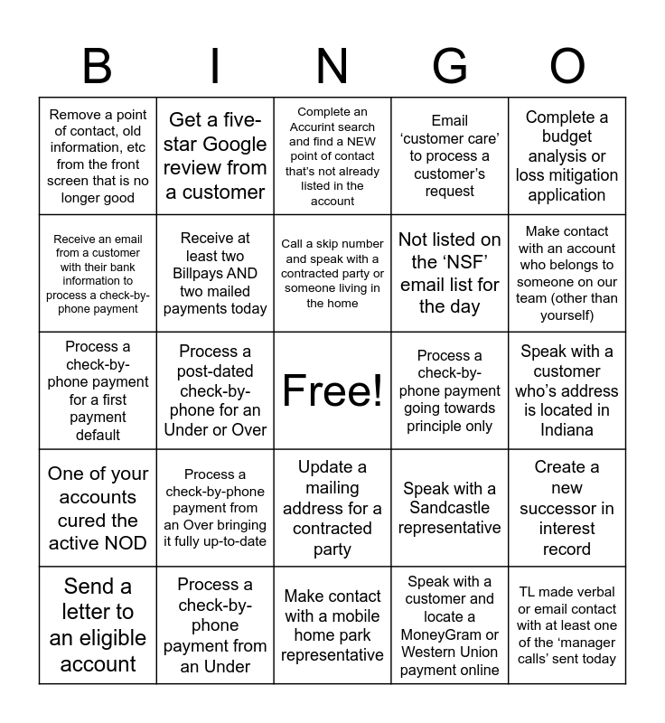 This bingo card has a free space and 24 words: Process a check-by-phone payment from an Over bringing it fully up-to-date, Process a check-by-phone payment from an Under, Call a skip number and speak with a contracted party or someone living in the home, Send a letter to an eligible account, Complete a budget analysis or loss mitigation application, Remove a point of contact, old information, etc from the front screen that is no longer good, Receive an email from a customer with their bank information to process a check-by-phone payment, Get a five-star Google review from a customer, Process a check-by-phone payment going towards principle only, Update a mailing address for a contracted party, Not listed on the ‘NSF’ email list for the day, Process a check-by-phone payment for a first payment default, Speak with a Sandcastle representative, Create a new successor in interest record, Receive at least two Billpays AND two mailed payments today, Speak with a customer and locate a MoneyGram or Western Union payment online, Speak with a customer who’s address is located in Indiana, Complete an Accurint search and find a NEW point of contact that’s not already listed in the account, Make contact with an account who belongs to someone on our team (other than yourself), Process a post-dated check-by-phone for an Under or Over, TL made verbal or email contact with at least one of the ‘manager calls’ sent today, One of your accounts cured the active NOD, Email ‘customer care’ to process a customer’s request and Make contact with a mobile home park representative.