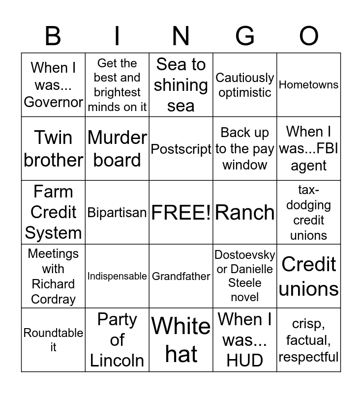 This bingo card has a free space and 24 words: Indispensable, Party of Lincoln, Postscript, Roundtable it, Hometowns, When I was... Governor, Twin brother, Get the best and brightest minds on it, Ranch, Grandfather, Back up to the pay window, Farm Credit System, Dostoevsky or Danielle Steele novel, Credit unions, Murder board, When I was... HUD, tax-dodging credit unions, Sea to shining sea, When I was...FBI agent, Bipartisan, crisp, factual, respectful, Meetings with Richard Cordray, Cautiously optimistic and White hat.