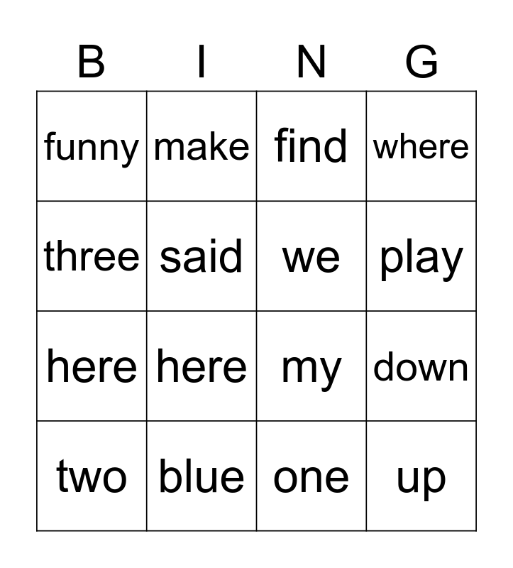 This bingo card has 16 words: blue, down, find, funny, here, make, my, one, three, said, two, where, here, play, we and up.