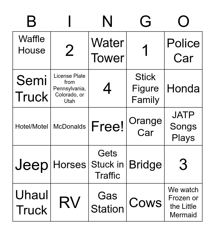 This bingo card has a free space and 29 words: Uhaul Truck, Blue Car, McDonalds, Welcome to Louisiana Sign, Waffle House, Water Tower, License Plate from Pennsylvania, Colorado, or Utah, Horses, Orange Car, RV, JATP Songs Plays, We watch Frozen or the Little Mermaid, Gas Station, Cows, Honda, Airplane, Gets Stuck in Traffic, Jeep, Police Car, Hotel/Motel, Bridge, “Critical” item falls to an unreachable place, Stick Figure Family, Semi Truck, 1, 2, 3, 4 and 5.