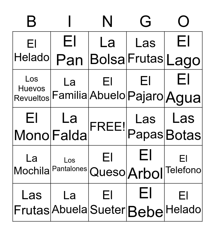 This bingo card has a free space and 24 words: Los Pantalones, La Abuela, El Abuelo, Las Frutas, El Lago, El Helado, Los Huevos Revueltos, El Pan, Las Papas, El Queso, El Pajaro, El Mono, El Arbol, El Telefono, La Familia, El Bebe, Las Botas, La Bolsa, El Agua, La Falda, El Helado, La Mochila, Las Frutas and El Sueter.