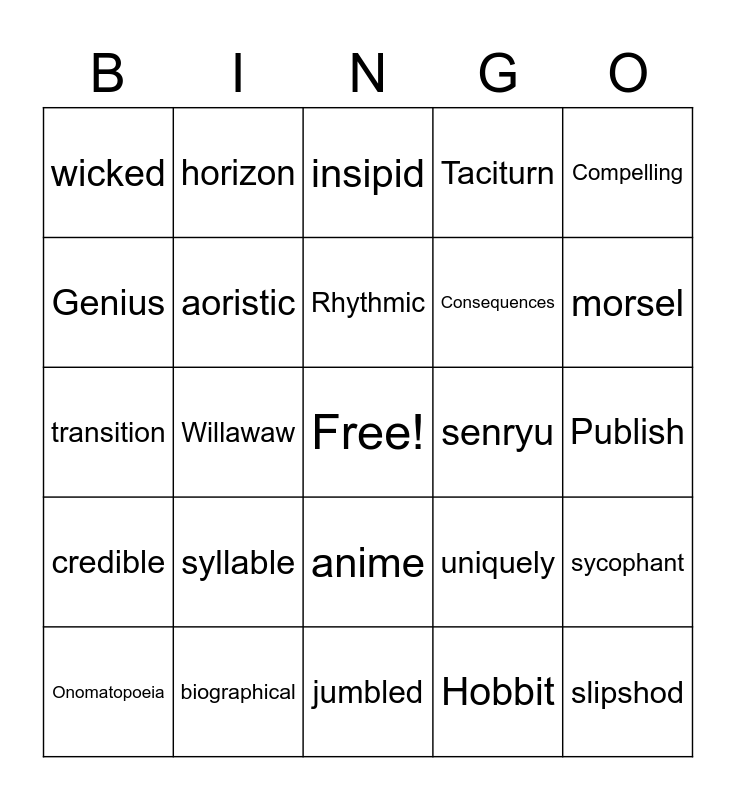 This bingo card has a free space and 136 words: Authority, Blurb, Nuances, Provocateur, Voluminous, Totsiens, Onomatopoeia, Essence, Quixotic, Passionate, Boondoggle, Dedicated, Amicable, Esoteric, Sparks, Sprightly, Ostreperous, Epicure, Diminutive, Embrace, jumbled, Reminisce, insipid, savvy, gallant, syllable, senryu, crepuscular, Convention, conclusion, credible, transition, Hobbit, Willawaw, expeditious, circumlocution, replete, context, Blackout, notions, slipshod, fathom, Glimpse, inexhaustible, anime, biographical, distressed, Altruism, anime, bumbershoot, desolate, Authority, blurb, agony, genre, peruse, Tantalizing, retrospect, accomplish, skimming, memoir, Compelling, bewildering, paragraph, creative, profoundly, Increment, renew, assessment, horizon, uniquely, Publish, narrating, resourceful, autobiography, reciprocate, Rhythmic, poetry, wicked, eerie, reflection, Taciturn, symphony, pandemic, luxurious, vaccine, Malarkey, transition, snivel, bugbear, harmony, Genius, ambrosial, shard, scurry, conform, Perfidy, adieu, eternities, domain, Chiaroscuro, Consequences, Gor, Clout, Ignoble, Revenge, Portentous, hideous, throbbing, wafted, coda, Extensive, aoristic, improvisational, incessant, amok, Comic, gulosity, prophesize, rhythm, explorations, Churlish, ominous, morsel, pachyderm, poacher, Constellations, sycophant, gadabout, haiku, hyperbole, Blackout, concealment, notions, fathom and slipshod.