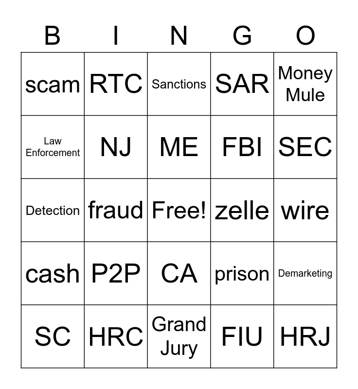 This bingo card has a free space and 39 words: AML, Subpoena, TD Bank, NJ, SC, CA, ME, Ponzi, Money Mule, cash, fraud, SAR, HRJ, wire, zelle, P2P, crook, scam, rich, prison, Law Enforcement, Grand Jury, FBI, SEC, DOJ, COVID, PPP, EIDL, Unemployment, RTC, Referral, GSI, Sanctions, HRC, FIU, PEP, Demarketing, Detection and SAS.