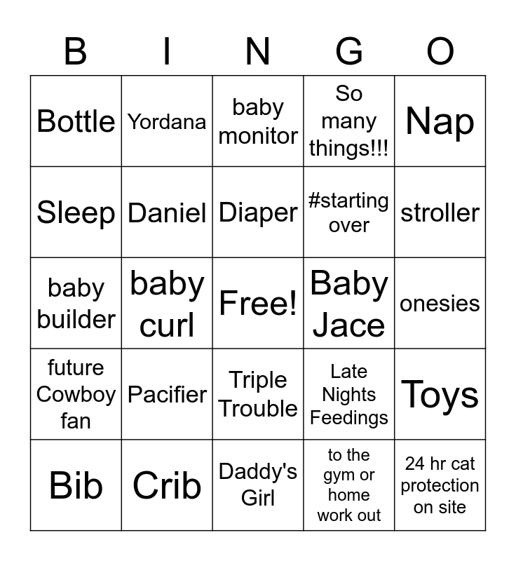 This bingo card has a free space and 24 words: Pacifier, Crib, Diaper, Bib, Nap, Bottle, Sleep, Yordana, Baby Jace, Triple Trouble, #starting over, baby builder, Late Nights Feedings, Toys, Daniel, to the gym or home work out, onesies, baby monitor, stroller, baby curl, 24 hr cat protection on site, future Cowboy fan, So many things!!! and Daddy's Girl.