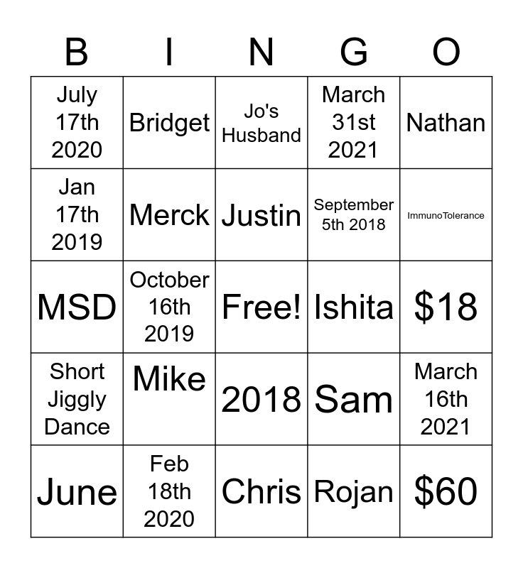 This bingo card has a free space and 34 words: Nevada, Rojan, Tell Therapeutics, David, Short Jiggly Dance, Merck, Nathan, June, Bridget, London and Paris, Justin, Jo's Husband, Osprey, First transfection and first IACUC protocol approved, Ishita, ImmunoTolerance, Feb 18th 2020, MSD, Mike, Sam, 2018, June 2017, July 17th 2020, $18, Chris, $60, March 31st 2021, An ELISA that did not work, September 5th 2018, Jan 17th 2019, Jyothsna, October 16th 2019, March 16th 2021 and Pia.