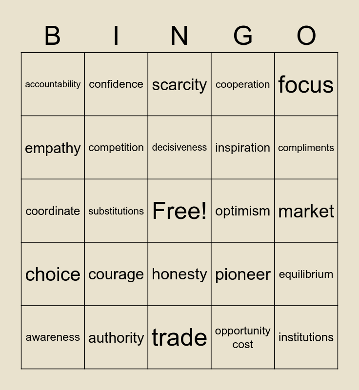This bingo card has a free space and 24 words: courage, authority, decisiveness, awareness, focus, accountability, empathy, confidence, optimism, honesty, inspiration, coordinate, pioneer, equilibrium, competition, opportunity cost, market, scarcity, compliments, substitutions, institutions, choice, cooperation and trade.