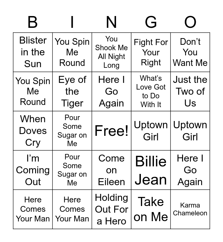 ⚠ This card has duplicate items: Take on Me (2), Sweet Child O’ Mine (2), Livin’ on a Prayer (2), Total Eclipse of the Heart (2), Girls Just Want to Have Fun (2), Billie Jean (2), I Wanna Dance with Somebody (2), Wake Me Up Before You Go-Go (2), Time After Time (2), When Doves Cry (2), Another One Bites the Dust (2), Don’t Stop Believing (2), Jump (2), Hungry Like the Wolf (2), Love Shack (2), Beat It (2), Careless Whisper (2), Africa (2), I Want to Know What Love Is (2), Walk Like an Egyptian (2), I Love Rock ‘n’ Roll (2), Here I Go Again (2), Down Under (2), Don’t You (Forget About Me) (2), Eye of the Tiger (2), Pour Some Sugar on Me (3), You Spin Me Round (3), Don’t You Want Me (3), You Shook Me All Night Long (3), Karma Chameleon (3), Sweet Dreams (3), Super Freak (3), Love is a Battlefield (3), Uptown Girl (3), Safety Dance (3), Material Girl (3), Never Gonna Give You Up (3), I Think We’re Alone Now (3), What’s Love Got to Do With It (3), Love Will Tear Us Apart (3), Blister in the Sun (3), Fast Car (3), Come on Eileen (3), I Ran (So Far Away) (3), Under Pressure (3), I’m Coming Out (3), With or Without You (3), Bust a Move (3), Burning Down the House (3), Fight For Your Right (3), Smooth Operator (3), Like a Prayer (3), Here Comes Your Man (3), Just the Two of Us (3), Call Me (3), Fight the Power (3), 867-5309 (3), Holding Out For a Hero (3)