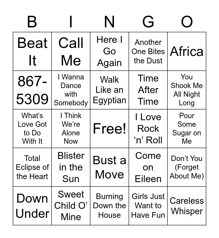 This bingo card has a free space and 58 words: Take on Me, Sweet Child O’ Mine, Livin’ on a Prayer, Total Eclipse of the Heart, Girls Just Want to Have Fun, Billie Jean, I Wanna Dance with Somebody, Wake Me Up Before You Go-Go, Time After Time, When Doves Cry, Another One Bites the Dust, Don’t Stop Believing, Jump, Hungry Like the Wolf, Love Shack, Beat It, Careless Whisper, Africa, I Want to Know What Love Is, Walk Like an Egyptian, I Love Rock ‘n’ Roll, Here I Go Again, Down Under, Don’t You (Forget About Me), Eye of the Tiger, Pour Some Sugar on Me, You Spin Me Round, Don’t You Want Me, You Shook Me All Night Long, Karma Chameleon, Sweet Dreams, Super Freak, Love is a Battlefield, Uptown Girl, Safety Dance, Material Girl, Never Gonna Give You Up, I Think We’re Alone Now, What’s Love Got to Do With It, Love Will Tear Us Apart, Blister in the Sun, Fast Car, Come on Eileen, I Ran (So Far Away), Under Pressure, I’m Coming Out, With or Without You, Bust a Move, Burning Down the House, Fight For Your Right, Smooth Operator, Like a Prayer, Here Comes Your Man, Just the Two of Us, Call Me, Fight the Power, 867-5309 and Holding Out For a Hero.