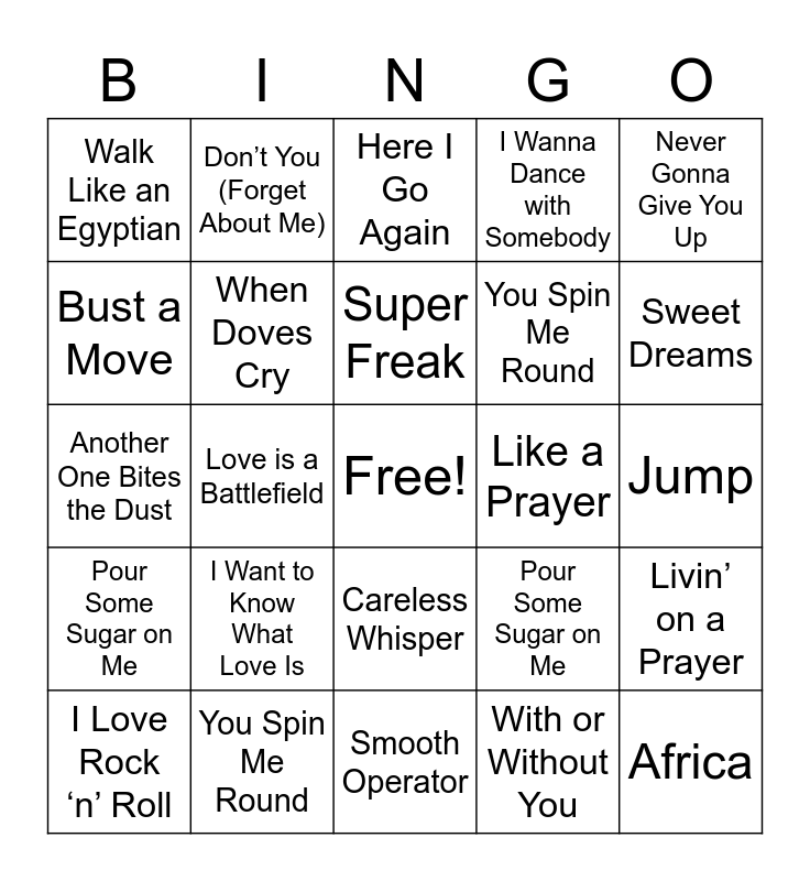 ⚠ This card has duplicate items: Take on Me (2), Sweet Child O’ Mine (2), Livin’ on a Prayer (2), Total Eclipse of the Heart (2), Girls Just Want to Have Fun (2), Billie Jean (2), I Wanna Dance with Somebody (2), Wake Me Up Before You Go-Go (2), Time After Time (2), When Doves Cry (2), Another One Bites the Dust (2), Don’t Stop Believing (2), Jump (2), Hungry Like the Wolf (2), Love Shack (2), Beat It (2), Careless Whisper (2), Africa (2), I Want to Know What Love Is (2), Walk Like an Egyptian (2), I Love Rock ‘n’ Roll (2), Here I Go Again (2), Down Under (2), Don’t You (Forget About Me) (2), Eye of the Tiger (2), Pour Some Sugar on Me (2), You Spin Me Round (2), Don’t You Want Me (2), You Shook Me All Night Long (2), Karma Chameleon (2), Sweet Dreams (2), Super Freak (2), Love is a Battlefield (2), Uptown Girl (2), Safety Dance (2), Material Girl (2), Never Gonna Give You Up (2), I Think We’re Alone Now (2), What’s Love Got to Do With It (2), Love Will Tear Us Apart (2), Blister in the Sun (2), Fast Car (2), Come on Eileen (2), I Ran (So Far Away) (2), Under Pressure (2), I’m Coming Out (2), With or Without You (2), Bust a Move (2), Burning Down the House (2), Fight For Your Right (2), Smooth Operator (2), Like a Prayer (2), Here Comes Your Man (2), Just the Two of Us (2), Call Me (2), Fight the Power (2), 867-5309 (2), Holding Out For a Hero (2)