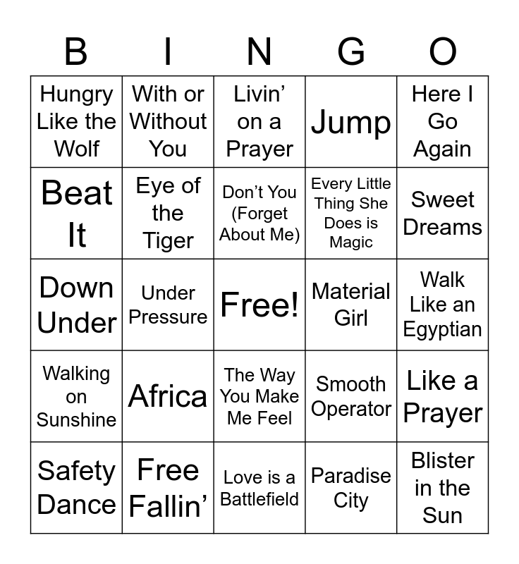 This bingo card has a free space and 81 words: Take on Me, Sweet Child O’ Mine, Livin’ on a Prayer, Total Eclipse of the Heart, Girls Just Want to Have Fun, Billie Jean, I Wanna Dance with Somebody, Wake Me Up Before You Go-Go, Time After Time, When Doves Cry, Another One Bites the Dust, Don’t Stop Believing, Jump, Hungry Like the Wolf, Love Shack, Beat It, Careless Whisper, Africa, I Want to Know What Love Is, Walk Like an Egyptian, I Love Rock ‘n’ Roll, Here I Go Again, Down Under, Don’t You (Forget About Me), Eye of the Tiger, Pour Some Sugar on Me, You Spin Me Round, Don’t You Want Me, You Shook Me All Night Long, Karma Chameleon, Sweet Dreams, Super Freak, Love is a Battlefield, Uptown Girl, Safety Dance, Material Girl, Never Gonna Give You Up, I Think We’re Alone Now, What’s Love Got to Do With It, Love Will Tear Us Apart, Blister in the Sun, Fast Car, Come on Eileen, I Ran (So Far Away), Under Pressure, I’m Coming Out, With or Without You, Bust a Move, Burning Down the House, Fight For Your Right, Smooth Operator, Like a Prayer, Here Comes Your Man, Just the Two of Us, Call Me, Fight the Power, 867-5309, Holding Out For a Hero, Thriller, Summer of 69, The Way You Make Me Feel, Push It, Faithfully, Crazy Little Thing Called Love, Take Me Home Tonight, White Wedding, Wild Thing, It’s Tricky, Sharp Dressed man, Hit Me With Your Best Shot, Any Way You Want It, Walking on Sunshine, Free Fallin’, You Give Love a Bad Name, Brass Monkey, It’s Raining Men, Back in Black, Paradise City, 1999, Every Little Thing She Does is Magic and Nothin’ But a Good Time.