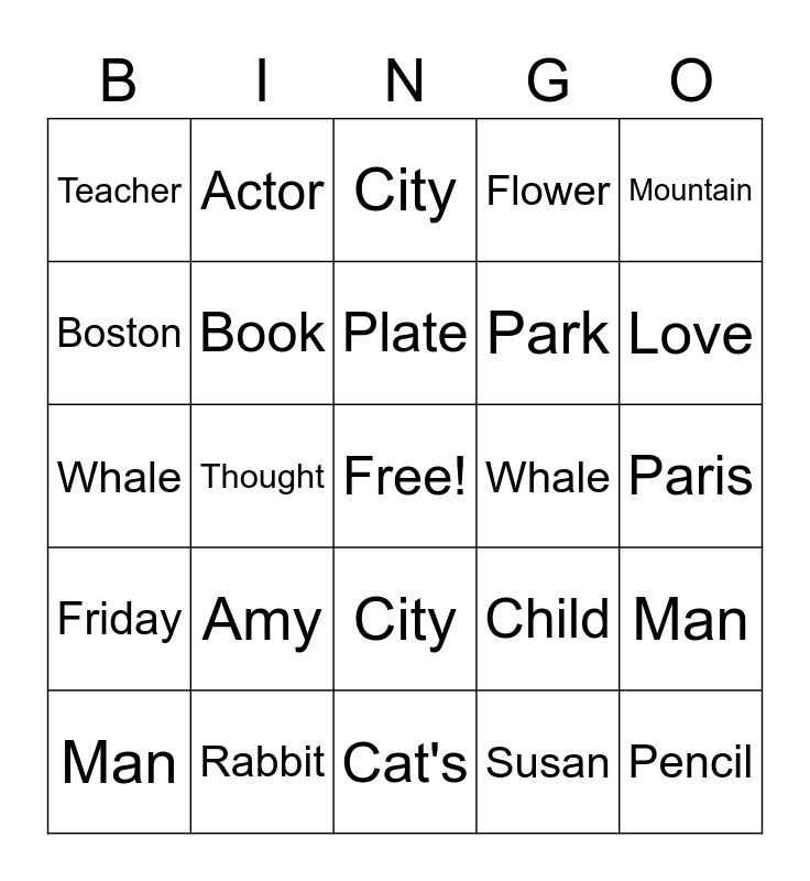 This bingo card has a free space and 24 words: Man, Amy, Plate, Susan, Mountain, Teacher, Actor, City, Whale, Paris, Whale, Book, Child, Man, Boston, Rabbit, Cat's, Flower, Love, Friday, Thought, City, Park and Pencil.