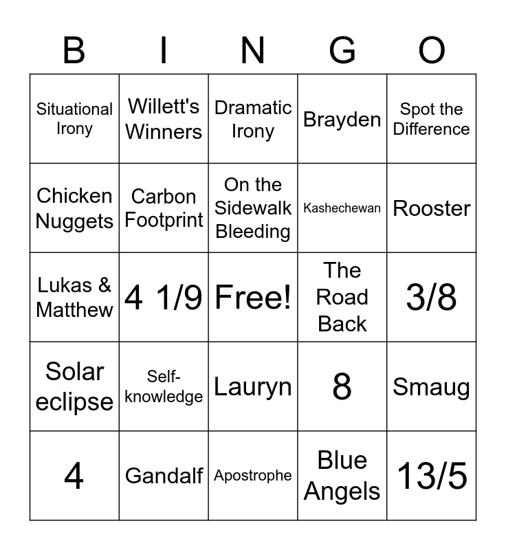 This bingo card has a free space and 29 words: 4, 3, 4 1/9, Verbal Irony, Situational Irony, Dramatic Irony, Carbon Footprint, Self-knowledge, The Road Back, Gandalf, 3/8, 13/5, Apostrophe, Blue Angels, Rooster, Drone, Lauryn, Solar eclipse, Spot the Difference, Lukas & Matthew, 8, Wolf, Kashechewan, Chicken Nuggets, Brayden, Willett's Winners, Smaug, On the Sidewalk Bleeding and Jesus.