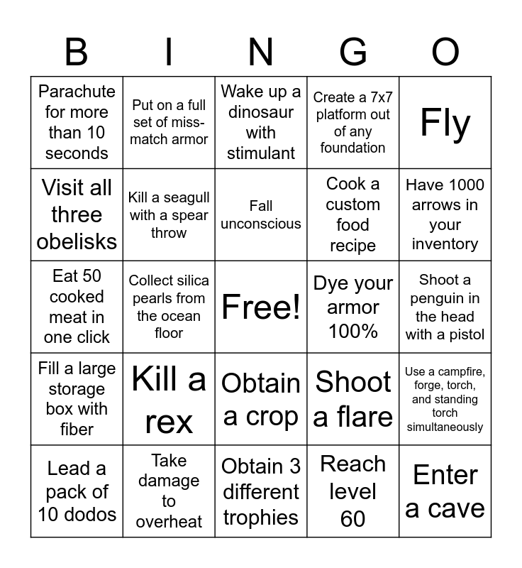 This bingo card has a free space and 25 words: Kill a rex, Obtain 3 different trophies, Fall unconscious, Lead a pack of 10 dodos, Fly, Parachute for more than 10 seconds, Visit all three obelisks, Put on a full set of miss-match armor, Dye your armor 100%, Obtain a crop, Cook a custom food recipe, Eat 50 cooked meat in one click, Shoot a flare, Use a campfire, forge, torch, and standing torch simultaneously, Kill a seagull with a spear throw, Mate two dinos, Shoot a penguin in the head with a pistol, Wake up a dinosaur with stimulant, Have 1000 arrows in your inventory, Collect silica pearls from the ocean floor, Enter a cave, Take damage to overheat, Fill a large storage box with fiber, Create a 7x7 platform out of any foundation and Reach level 60.