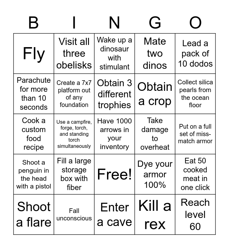 This bingo card has 26 words: Free!, Kill a rex, Obtain 3 different trophies, Fall unconscious, Lead a pack of 10 dodos, Fly, Parachute for more than 10 seconds, Visit all three obelisks, Put on a full set of miss-match armor, Dye your armor 100%, Obtain a crop, Cook a custom food recipe, Eat 50 cooked meat in one click, Shoot a flare, Use a campfire, forge, torch, and standing torch simultaneously, Kill a seagull with a spear throw, Mate two dinos, Shoot a penguin in the head with a pistol, Wake up a dinosaur with stimulant, Have 1000 arrows in your inventory, Collect silica pearls from the ocean floor, Enter a cave, Take damage to overheat, Fill a large storage box with fiber, Create a 7x7 platform out of any foundation and Reach level 60.