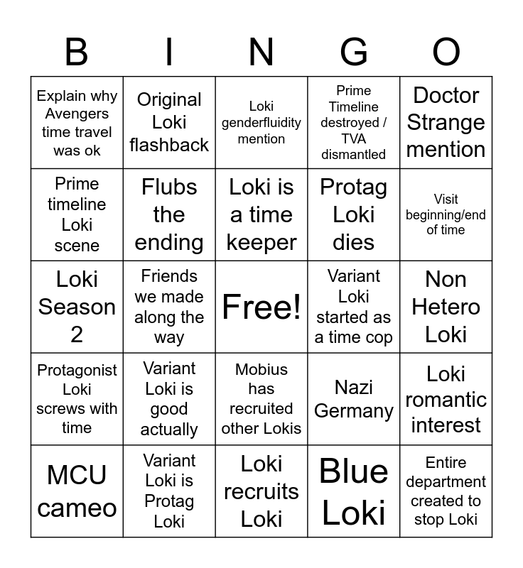 This bingo card has a free space and 24 words: Variant Loki is good actually, Variant Loki is Protag Loki, Loki is a time keeper, MCU cameo, Doctor Strange mention, Explain why Avengers time travel was ok, Prime timeline Loki scene, Original Loki flashback, Variant Loki started as a time cop, Mobius has recruited other Lokis, Protag Loki dies, Loki Season 2, Nazi Germany, Loki romantic interest, Flubs the ending, Blue Loki, Non Hetero Loki, Loki genderfluidity mention, Visit beginning/end of time, Friends we made along the way, Entire department created to stop Loki, Protagonist Loki screws with time, Prime Timeline destroyed / TVA dismantled and Loki recruits Loki.