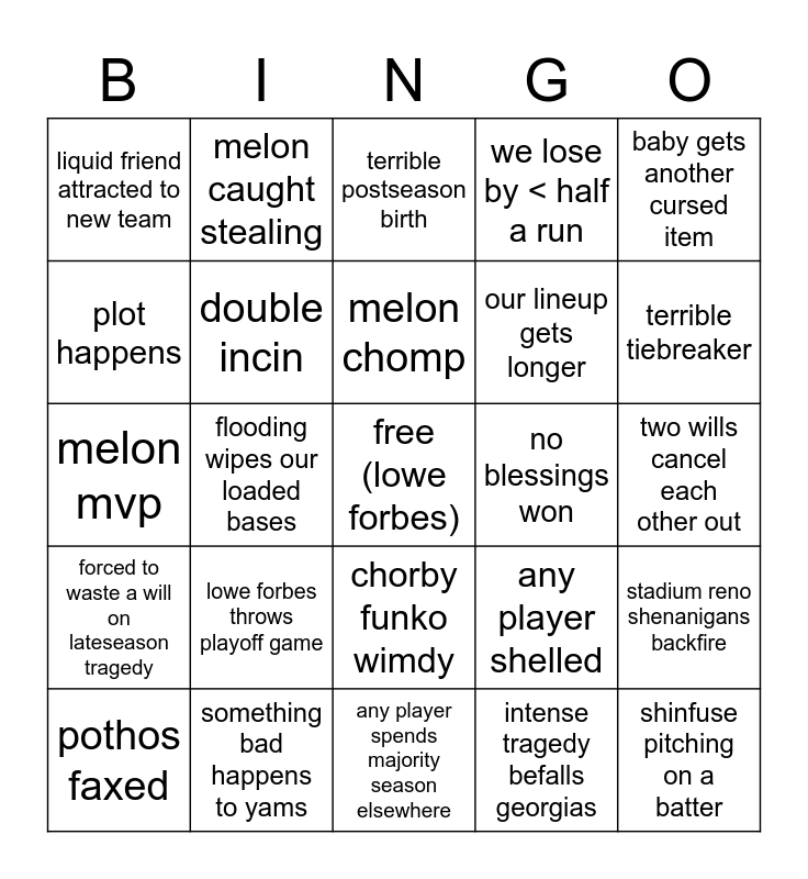This bingo card has a free space and 24 words: pothos faxed, lowe forbes throws playoff game, melon chomp, intense tragedy befalls georgias, baby gets another cursed item, liquid friend attracted to new team, melon caught stealing, terrible postseason birth, no blessings won, two wills cancel each other out, melon mvp, double incin, any player shelled, stadium reno shenanigans backfire, plot happens, something bad happens to yams, any player spends majority season elsewhere, we lose by < half a run, terrible tiebreaker, forced to waste a will on lateseason tragedy, flooding wipes our loaded bases, chorby funko wimdy, our lineup gets longer and shinfuse pitching on a batter.