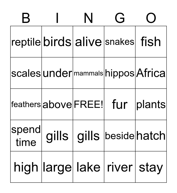 This bingo card has a free space and 24 words: gills, large, mammals, high, fish, reptile, scales, birds, fur, gills, hippos, feathers, beside, hatch, under, river, plants, alive, Africa, above, stay, spend time, snakes and lake.