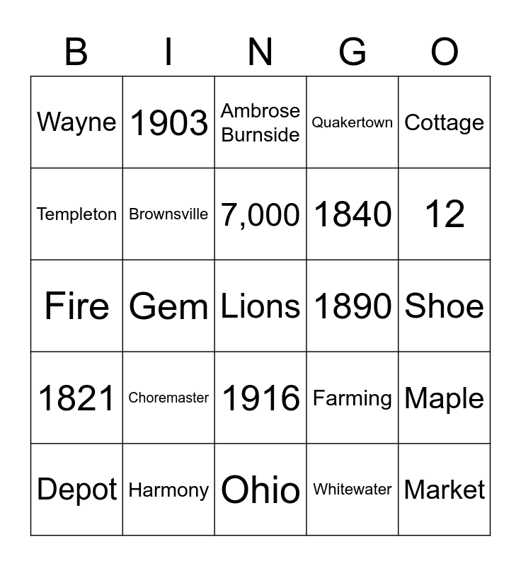 This bingo card has 25 words: 1821, Harmony, Lions, Whitewater, Cottage, Wayne, 1903, Ambrose Burnside, 1890, Maple, Templeton, Brownsville, Ohio, Farming, 12, Depot, Gem, 7,000, 1840, Shoe, Fire, Choremaster, 1916, Quakertown and Market.