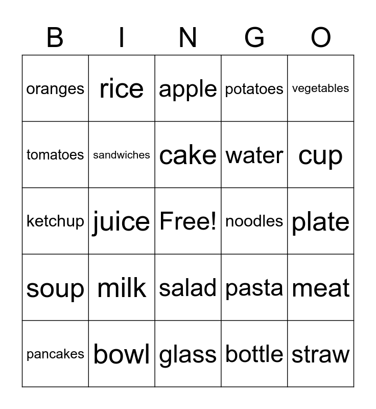 This bingo card has a free space and 29 words: pancakes, milkshake, juice, soda, oranges, apple, sandwiches, milk, noodles, bowl, plate, straw, glass, bottle, cup, gabage, salad, soup, vegetables, ketchup, pasta, bread, water, tomatoes, potatoes, rice, meat, cake and ice cream.