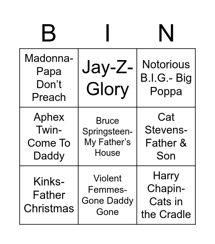 This bingo card has 17 words: Temptations- Papa Was A Rolling Stone, James Brown- Papa’s Got A Brand New Bag, Notorious B.I.G.- Big Poppa, Madonna- Papa Don’t Preach, Johnny Cash- Daddy Sang Bass, Aphex Twin- Come To Daddy, Everclear- Father of Mine, Kinks- Father Christmas, Violent Femmes- Gone Daddy Gone, Cat Stevens- Father & Son, Will Smith- Just the Two of Us, Dolly Parton- Daddy’s Working Boots, Bruce Springsteen- My Father’s House, Jay-Z- Glory, Harry Chapin- Cats in the Cradle, John Mayer- Daughters and Stevie Wonder- Isn’t She Lovely.