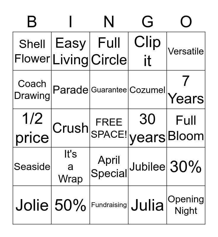 This bingo card has a free space and 24 words: It's a Wrap, 50%, Guarantee, Jolie, Versatile, Shell Flower, Coach Drawing, Easy Living, 30 years, April Special, Cozumel, 1/2 price, Jubilee, 30%, Parade, Julia, Full Bloom, Full Circle, 7 Years, Crush, Opening Night, Seaside, Clip it and Fundraising.